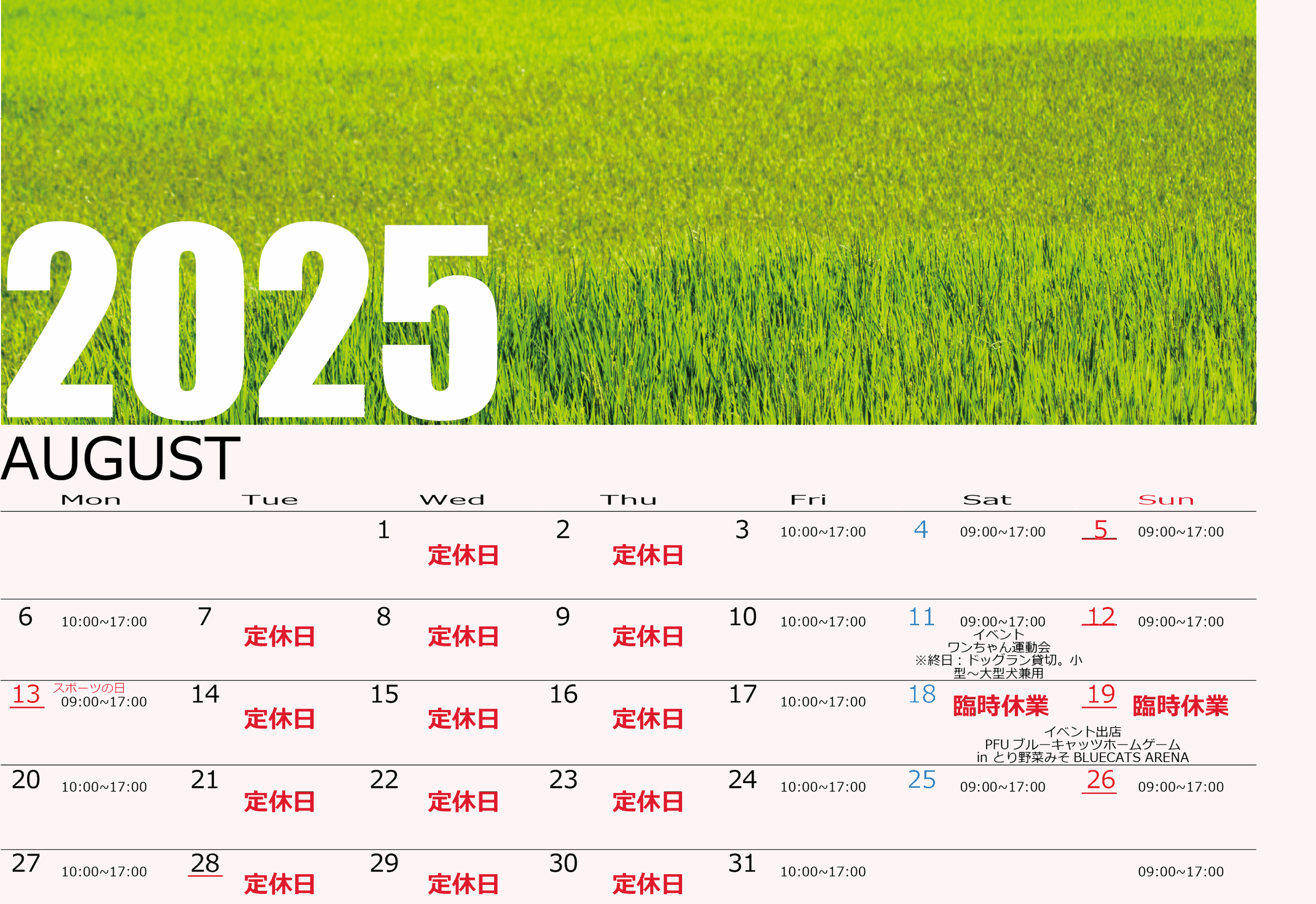 ー10月の営業カレンダーのご案内ー