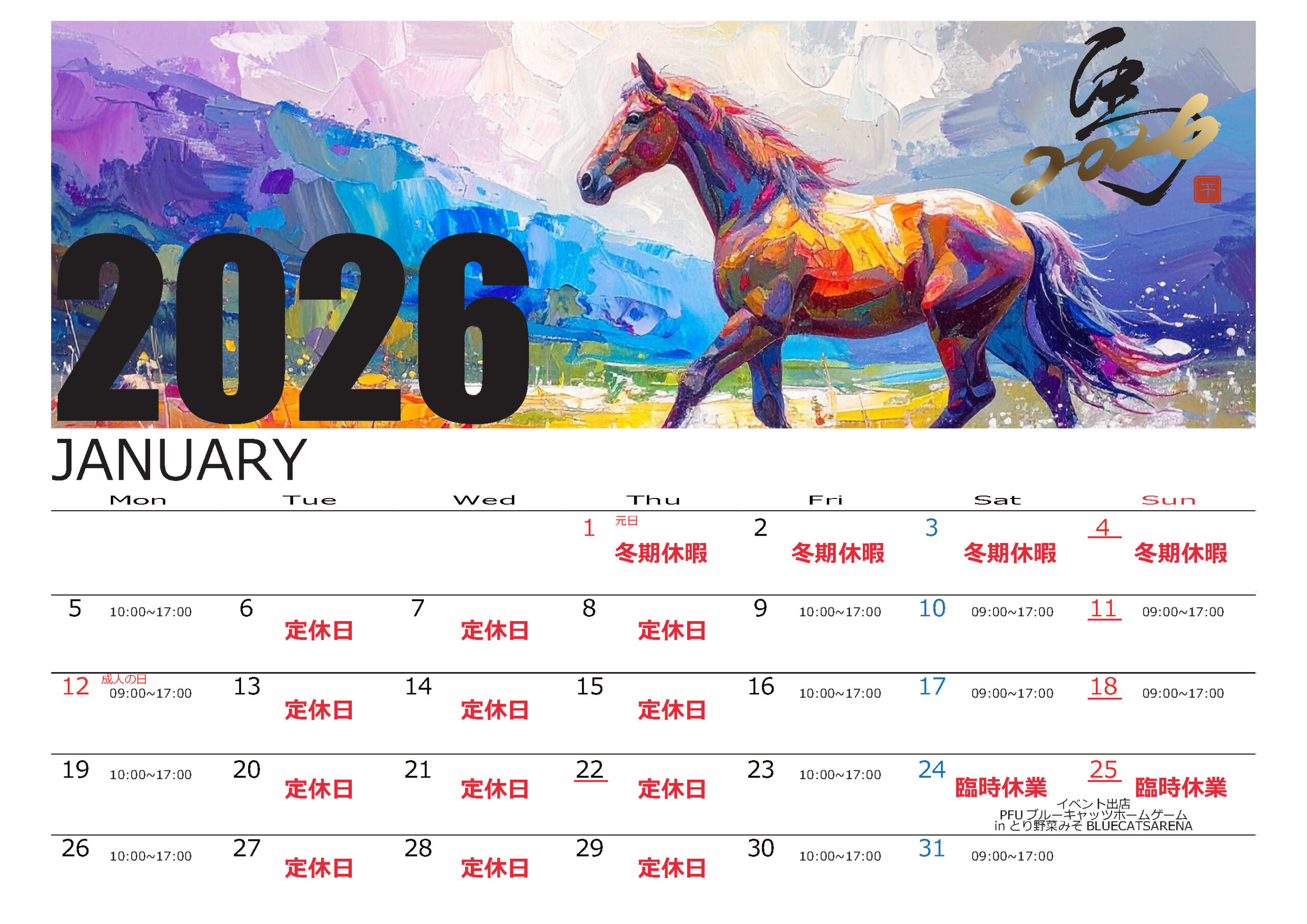 1月の営業カレンダーとなります。