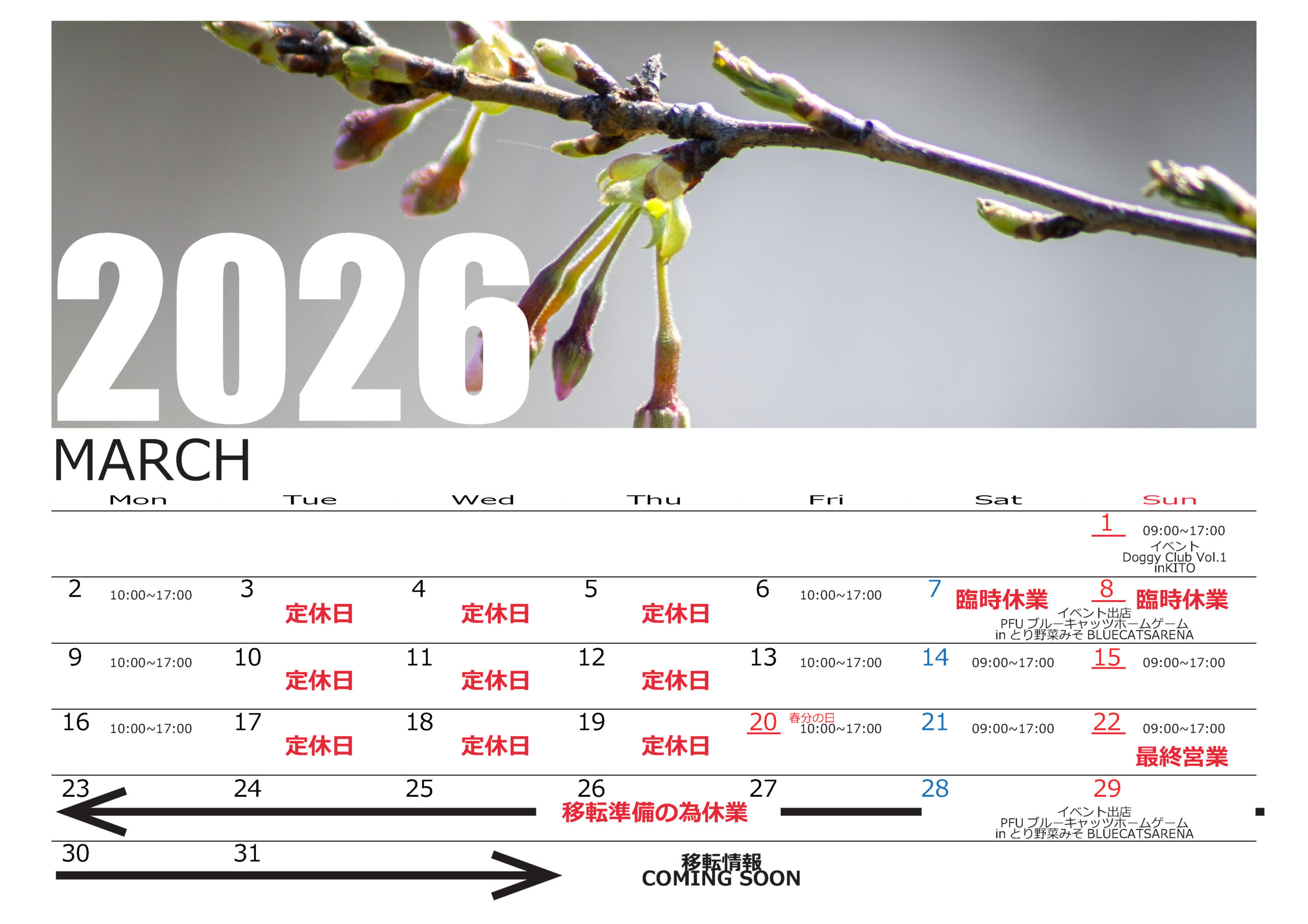 3月の営業カレンダーとなります。